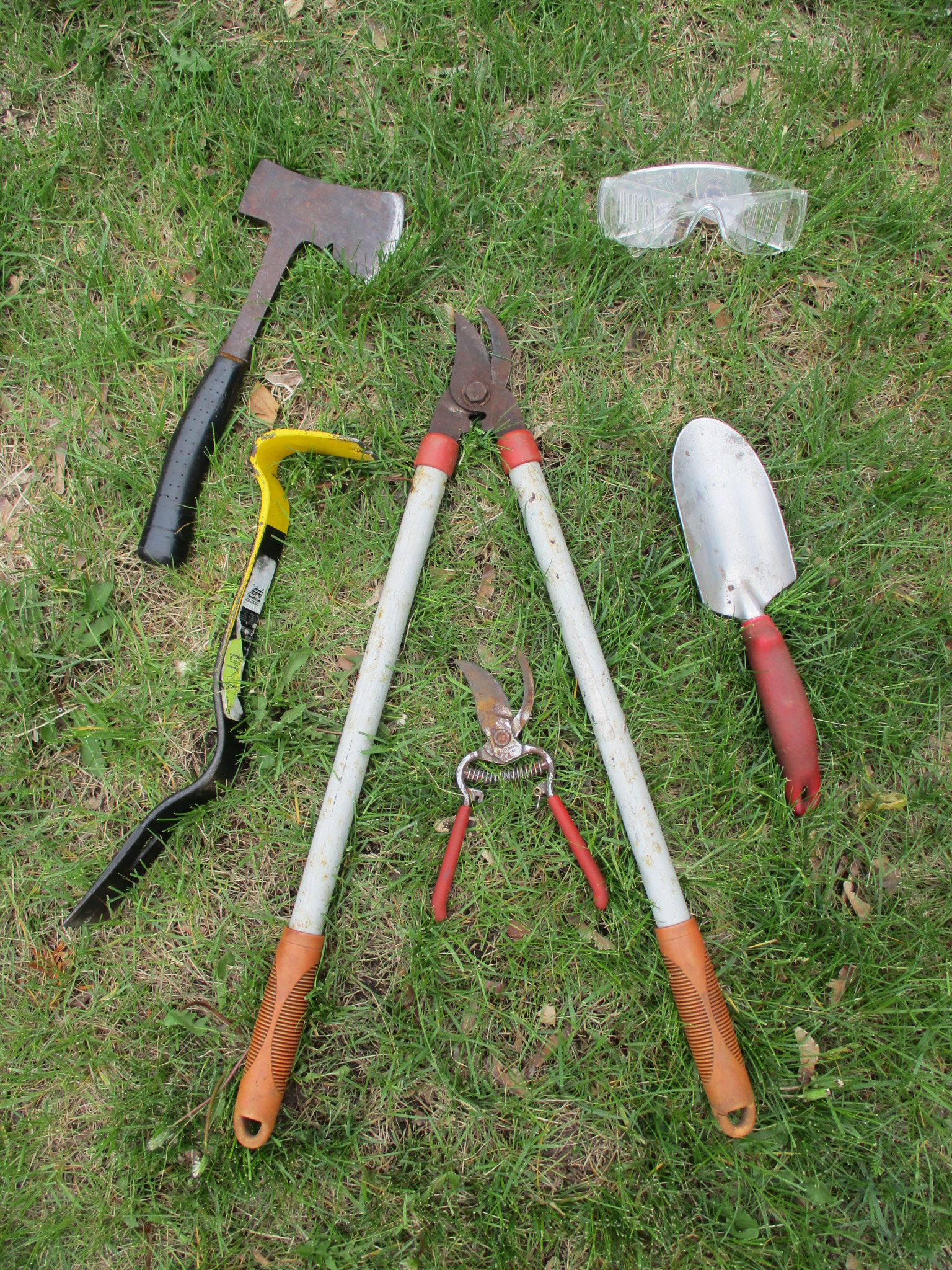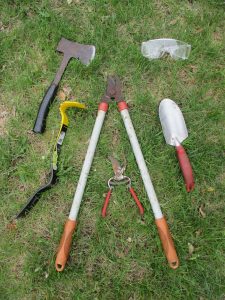 First you need the tools. You will need something that can cut accurately, plus some typical gardening gear. In my case I also used a small flat-bar to knock out the loose dry rot, and a hatchet to make the cuts.