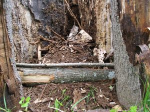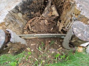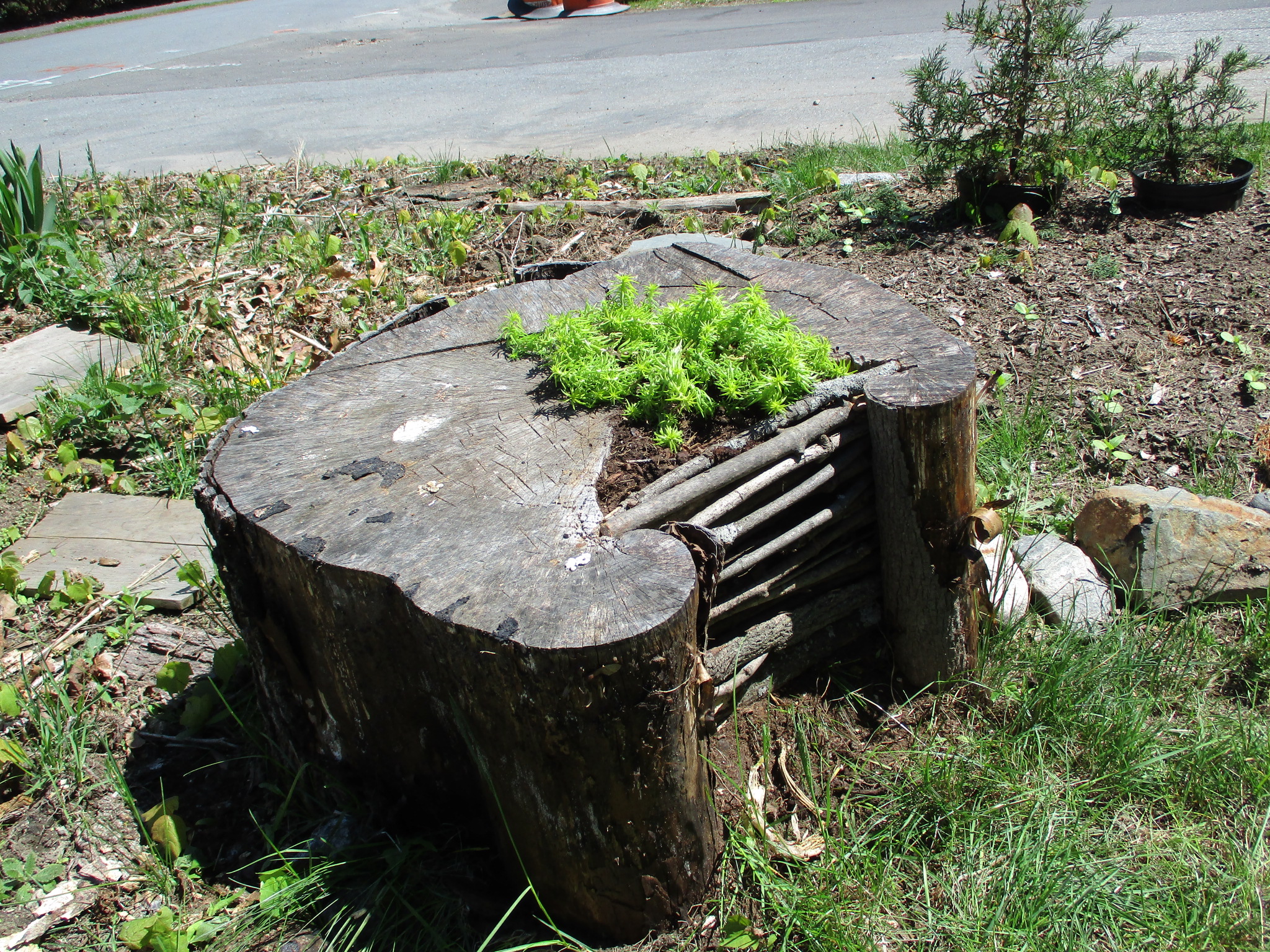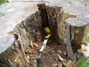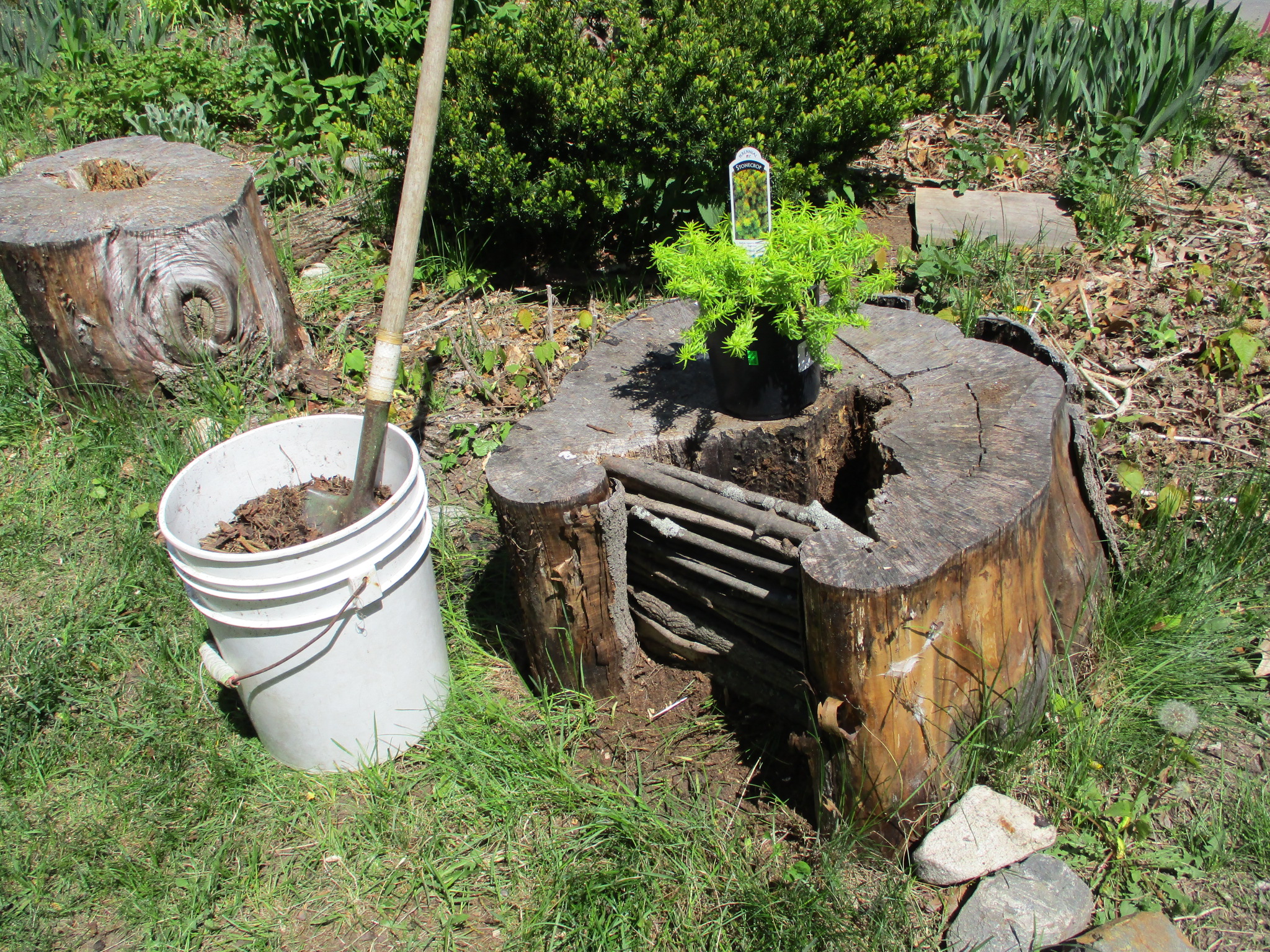 I was lucky enough to already have a pre-rotted stump in the shape of a “C.” The first step was to clear out the loose rot so I could eventually replace it with soil. I soon discovered why this particular stump was in such bad shape. Rumored long ago, this tree was struck by lightning. And buried inside was a long steel bolt which may have been an attempt at mending the tree. Unfortunately, that didn’t work out so well for the tree, but it did make a cavity of loose material that I easily cleared away with the flat bar.