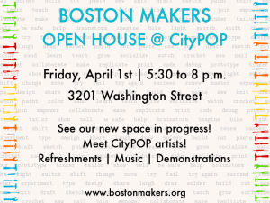 We are delighted to invite you to our new makerspace-in-progress at CityPOP on Friday, April 1. The open house will feature refreshments, 3D printing and other demonstrations, and a chance to talk with Boston Makers and artists at the new CityPOP community.…